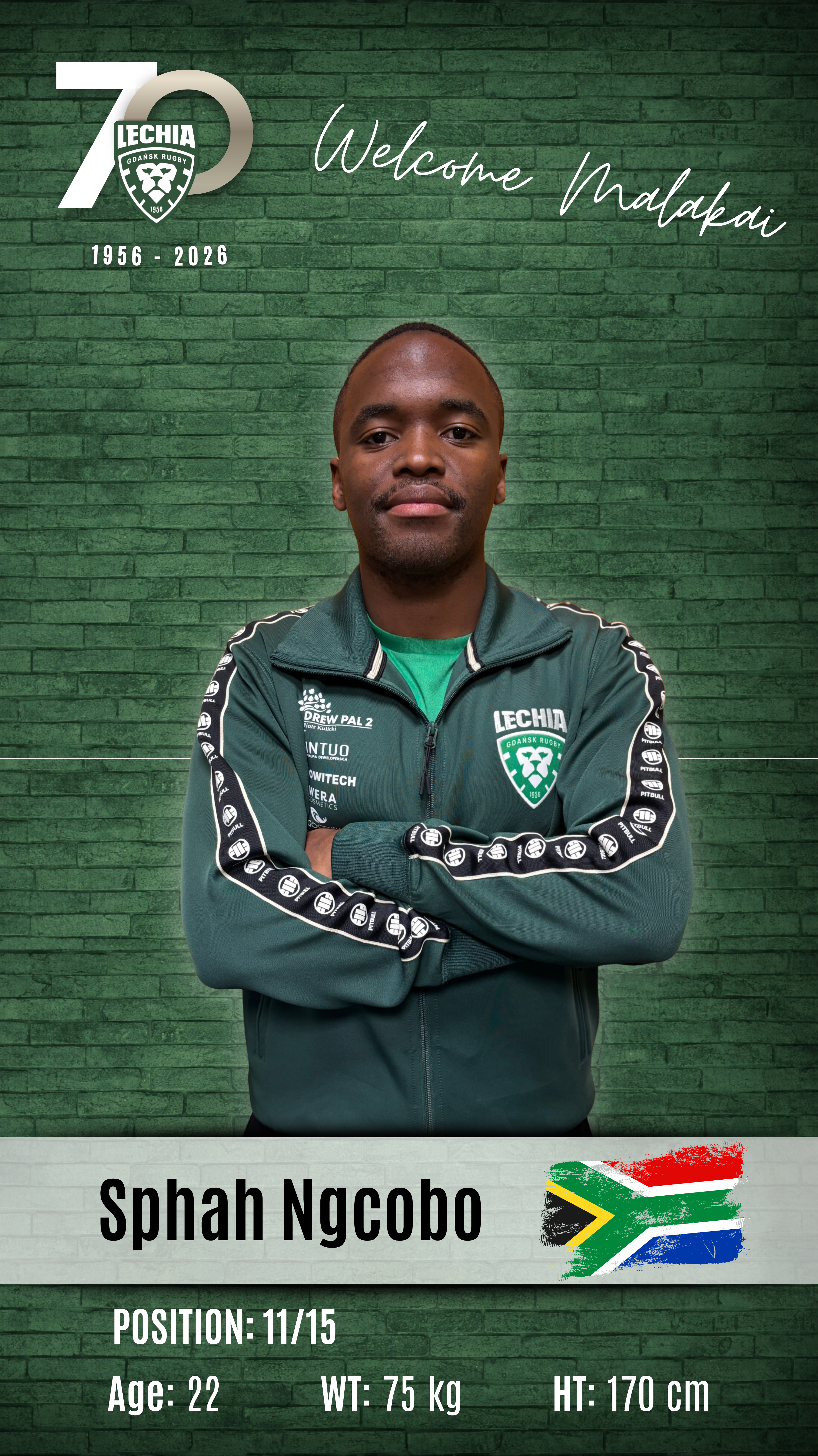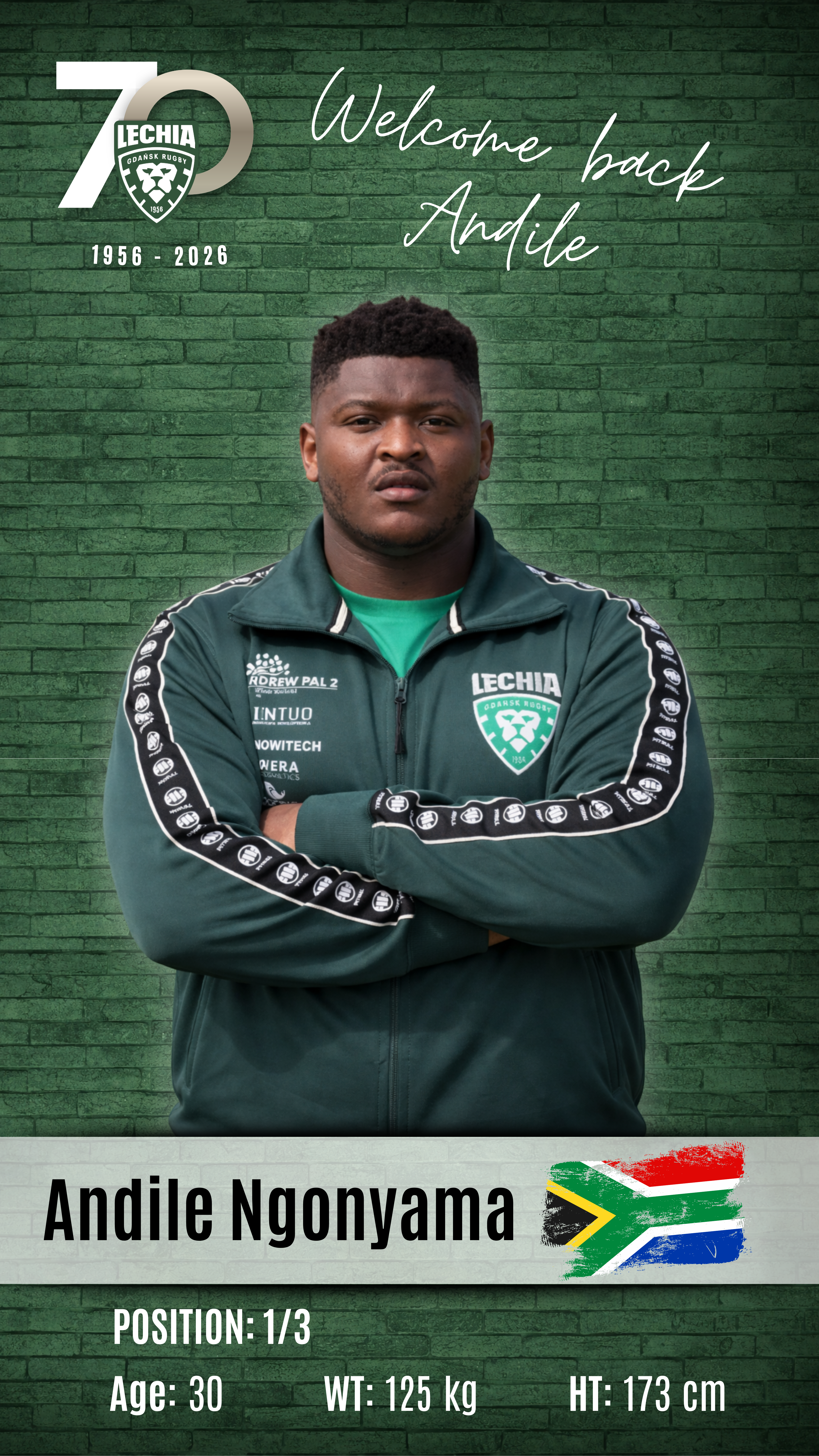 Andile Ngonyama – 30-letni filar młyna z RPA, zawodnik o dobrych warunkach fizycznych: 173 cm wzrostu i 125 kg wagi. W 2026 roku występował w drużynie EP Elephants rywalizującej w Currie Cup First Division. Kibice znają go bardzo dobrze, ponieważ w ubiegłej rundzie Ekstraligi Rugby reprezentował już Lechię. To zawodnik silny, solidny i pracowity, który będzie dużym wzmocnieniem formacji młyna.
