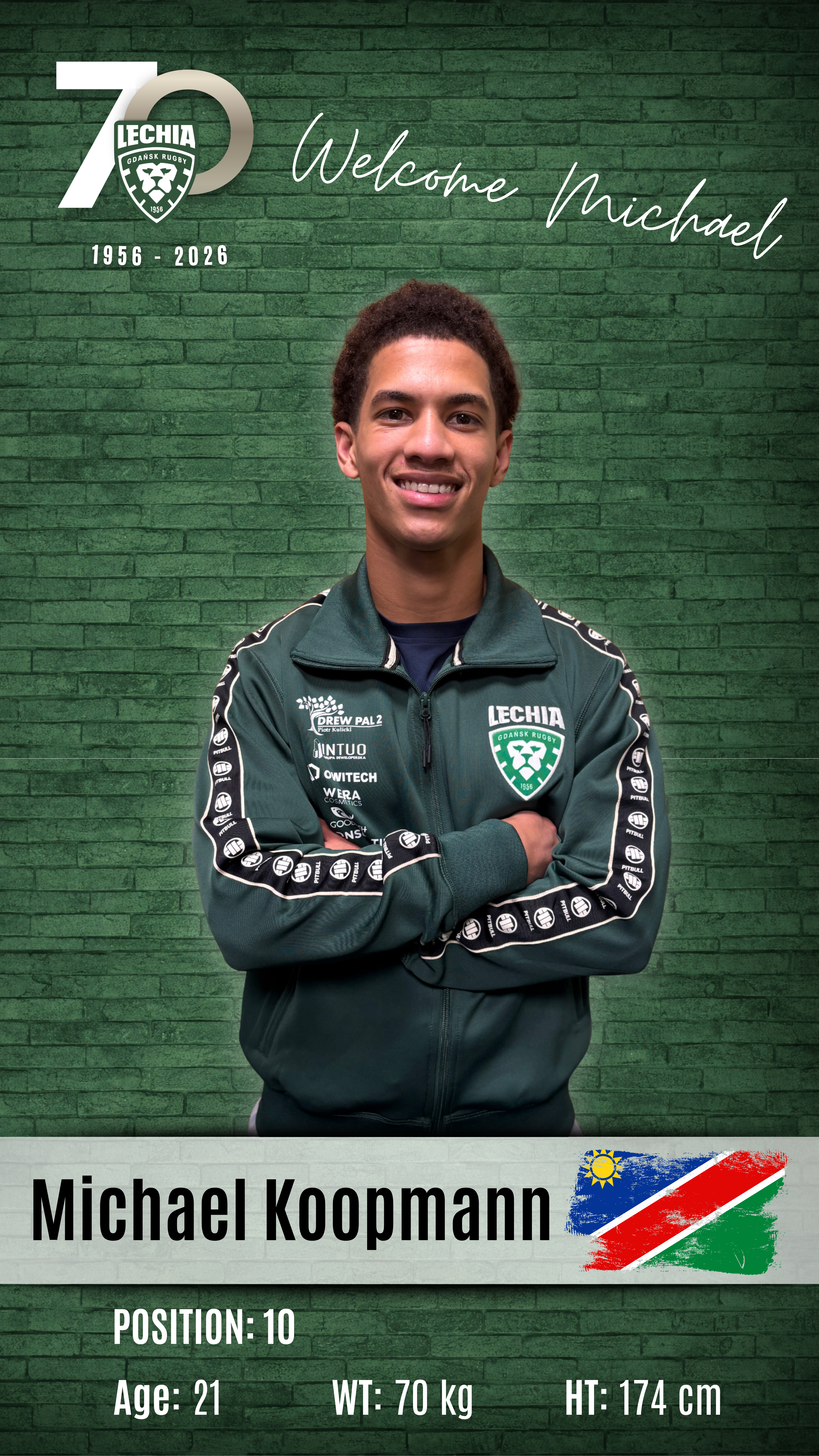 Michael Beunito Koopmann – 21-letni łącznik ataku z Namibii, zawodnik FNB Kudus, klasyczna „dziesiątka” z doskonałym przeglądem pola i pełną odpowiedzialnością za prowadzenie gry. Młody, ale doświadczony, potrafi nadawać rytm całemu zespołowi i wykorzystywać każdą szansę na zdobycie punktów. W czerwcu 2025 roku zapisał się z FNB Kudus w historii, sięgając po pierwszy tytuł Rugby Premier League po efektownym zwycięstwie 50:32 nad FNB Wanderers. Został wybrany zawodnikiem meczu, zdobywając 22 punkty.