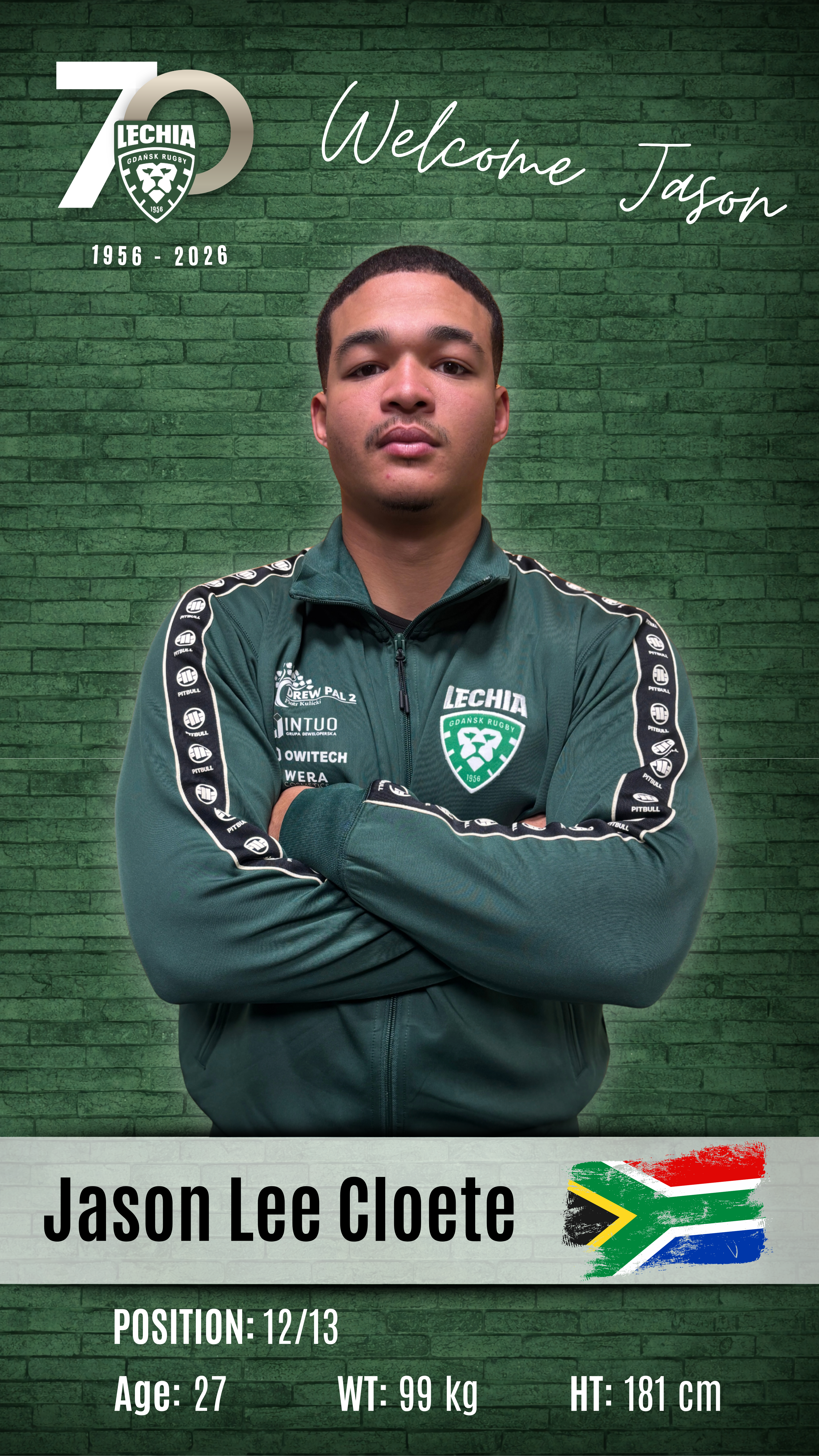Jason Lee Cloete – reprezentant RPA, 27-letni środkowy ataku, mierzący 181 cm i ważący 99 kg. Mocny, solidny i bardzo dobrze zbudowany do gry w centrum pola. Przeszedł drogę od UWC 7s do Wits University, gdzie występował w rozgrywkach Varsity Cup. Publiczne źródła opisywały go jako „former UWC star”, a w 2023 roku był już graczem Wits, gdzie zwracano uwagę na jego dobrą grę w środku pola. To zawodnik, który lubi twardą walkę i nie boi się odpowiedzialności.